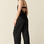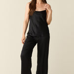 The Sienna is dreamy and sexy, made in an airy and soft satin. It features an open cowl back with an elasticized strap across the back to add a unique twist. The pants have a thin elastic waistband and wide leg fit.