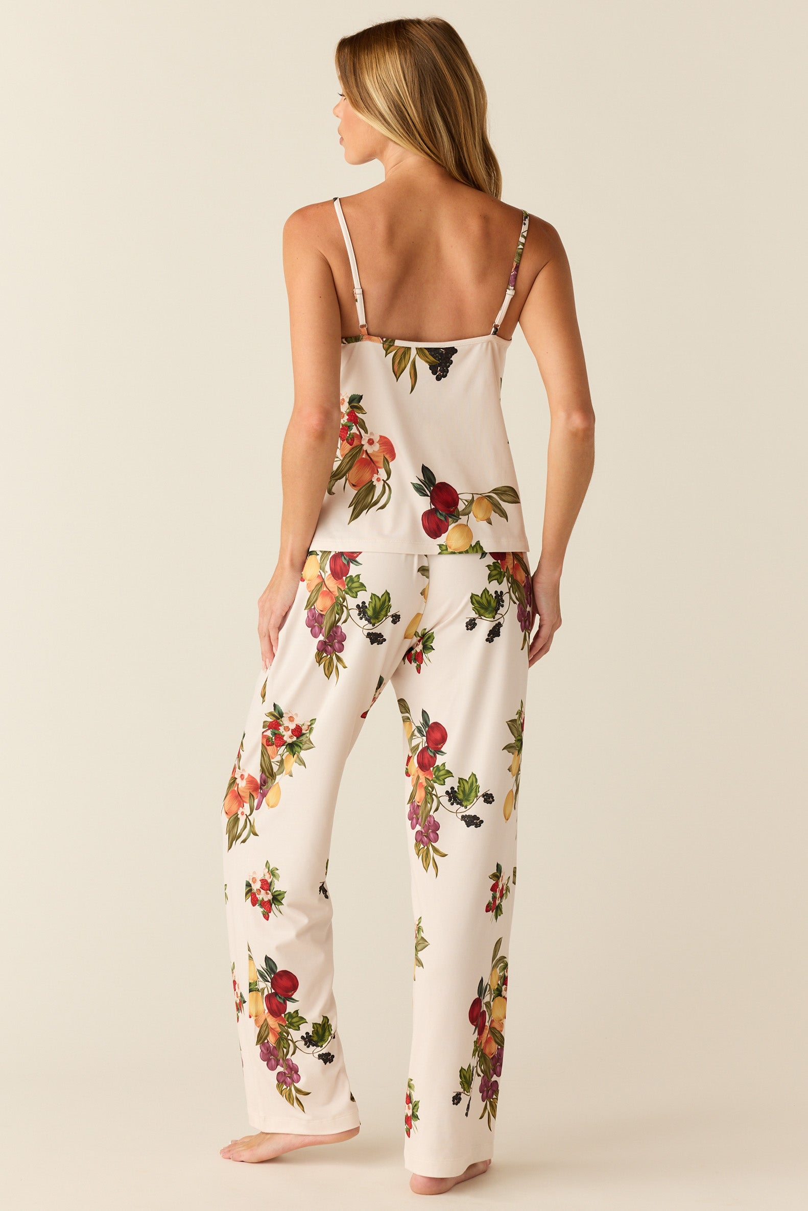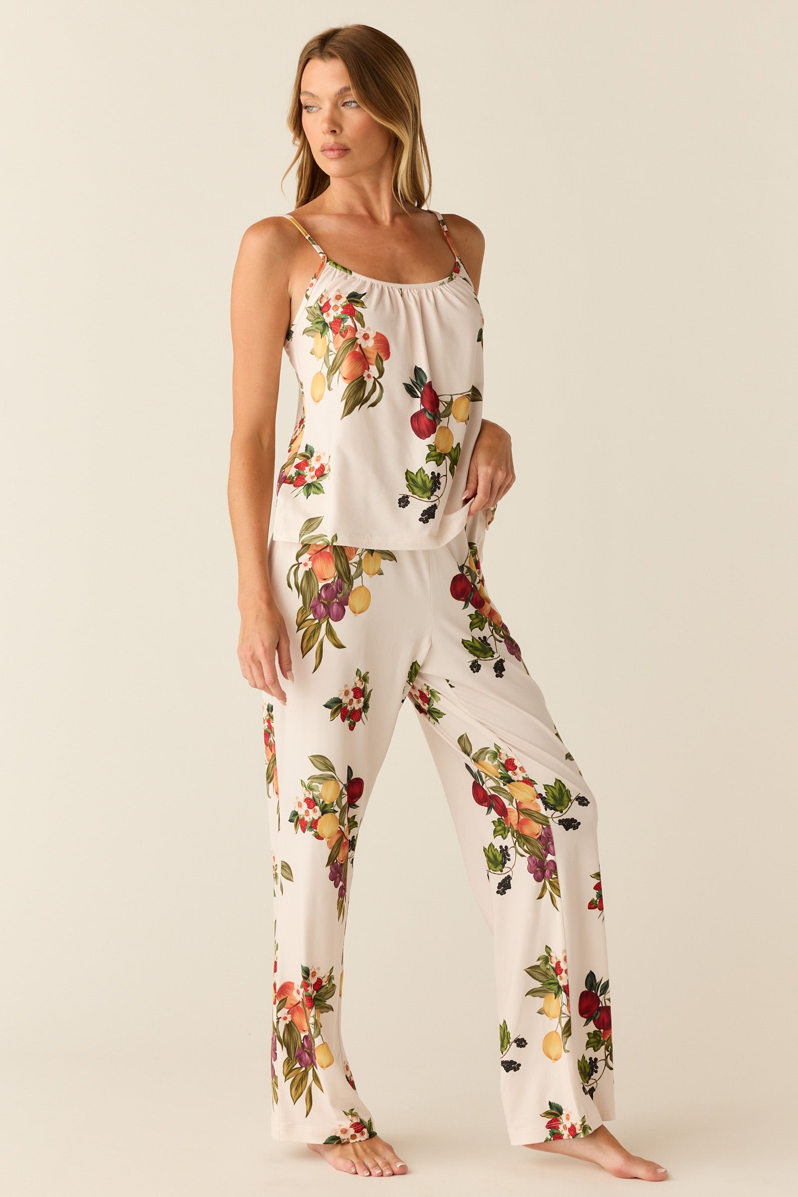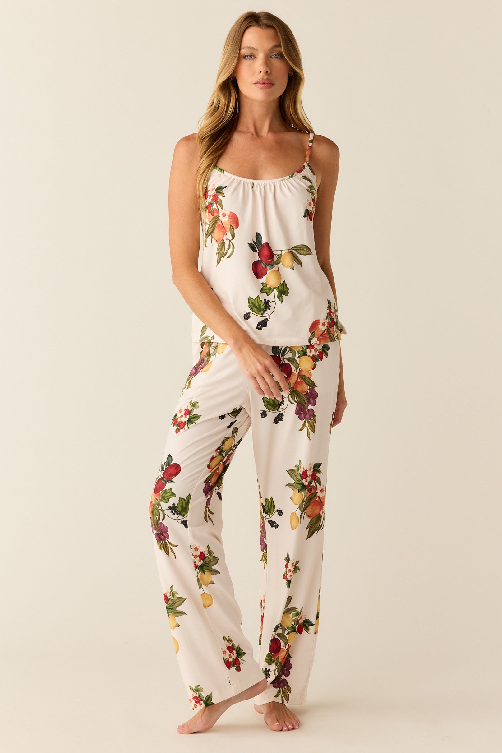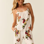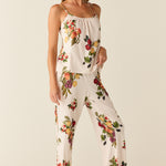Feminine and airy, the Bella offers simplicity without compromising style. It features a ruched scoop neck cami with a wide leg pant.