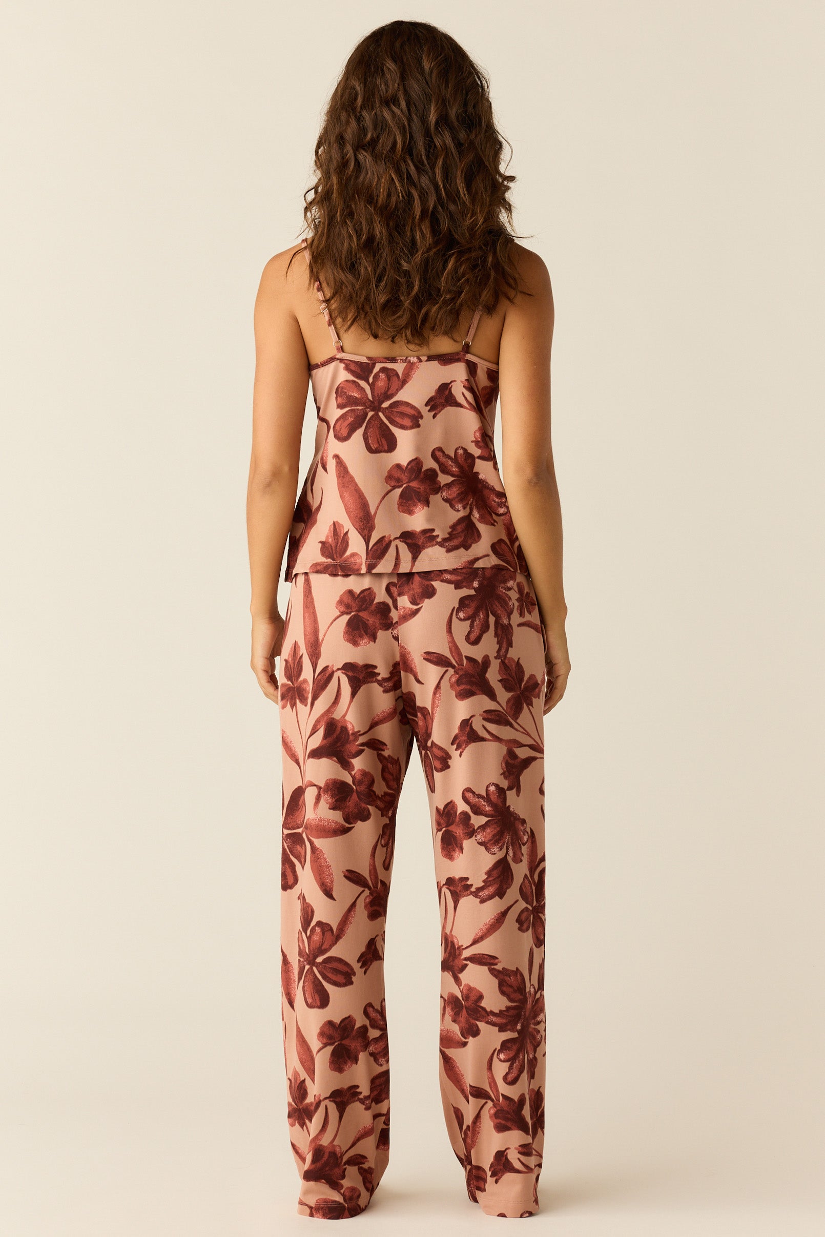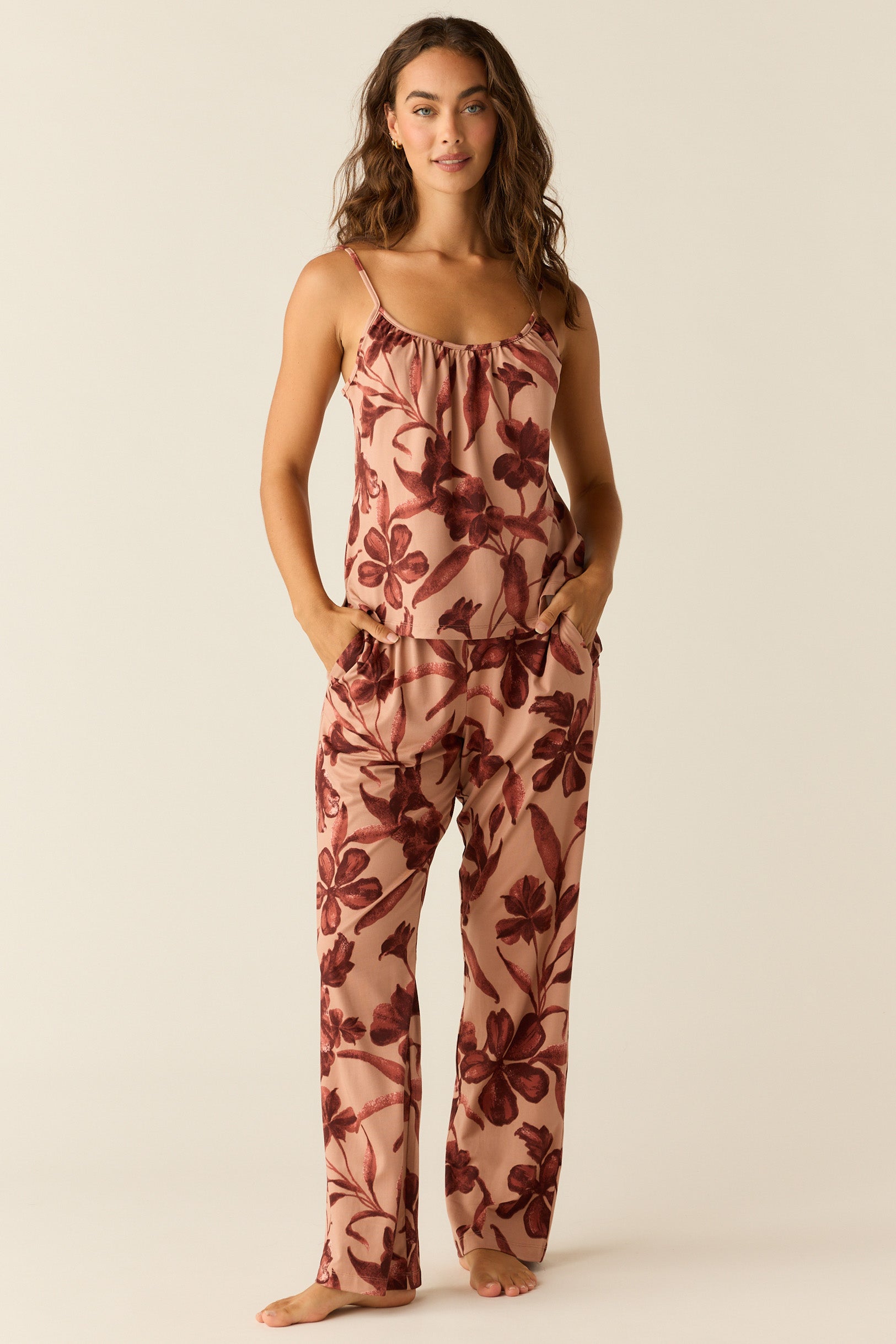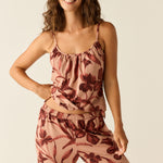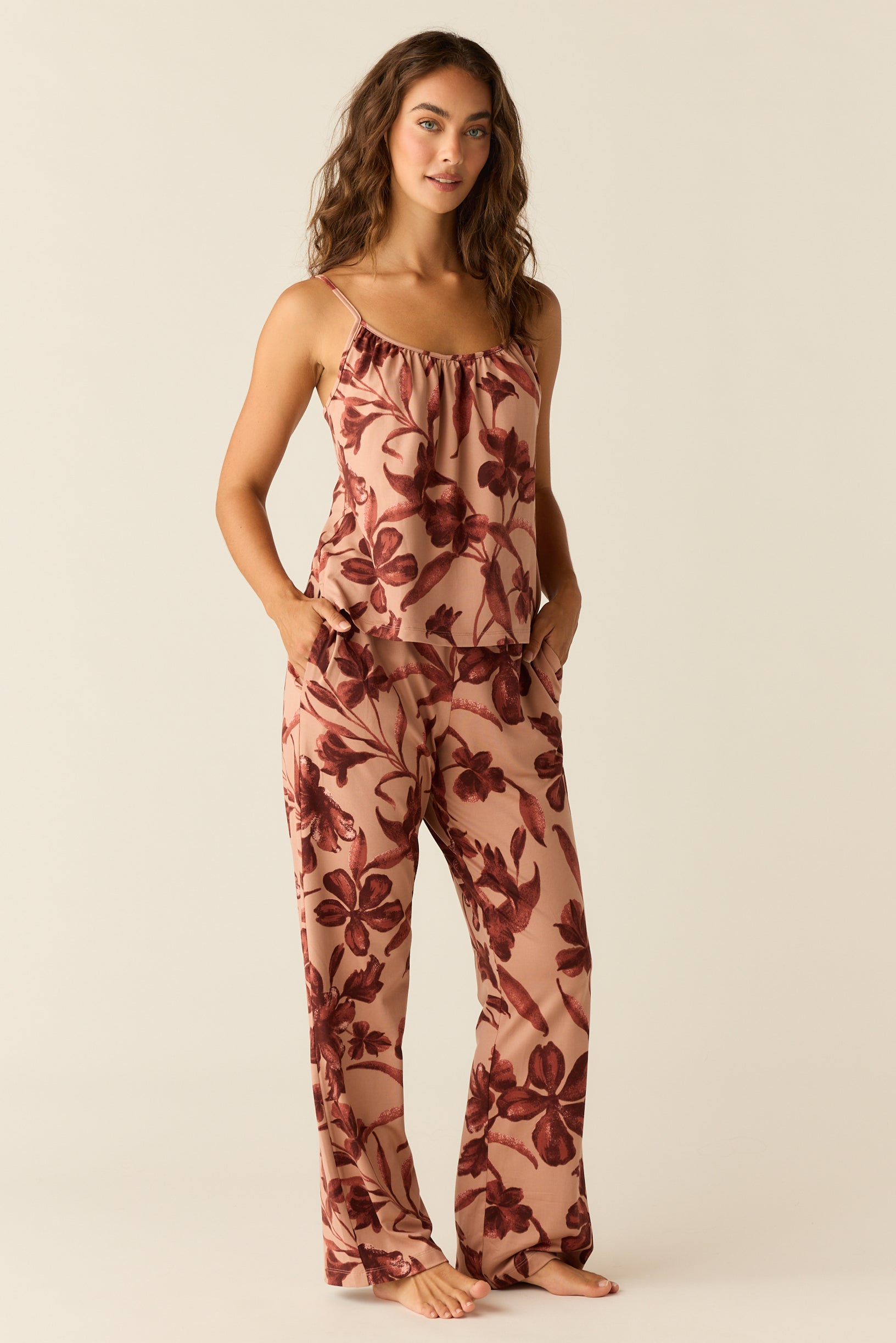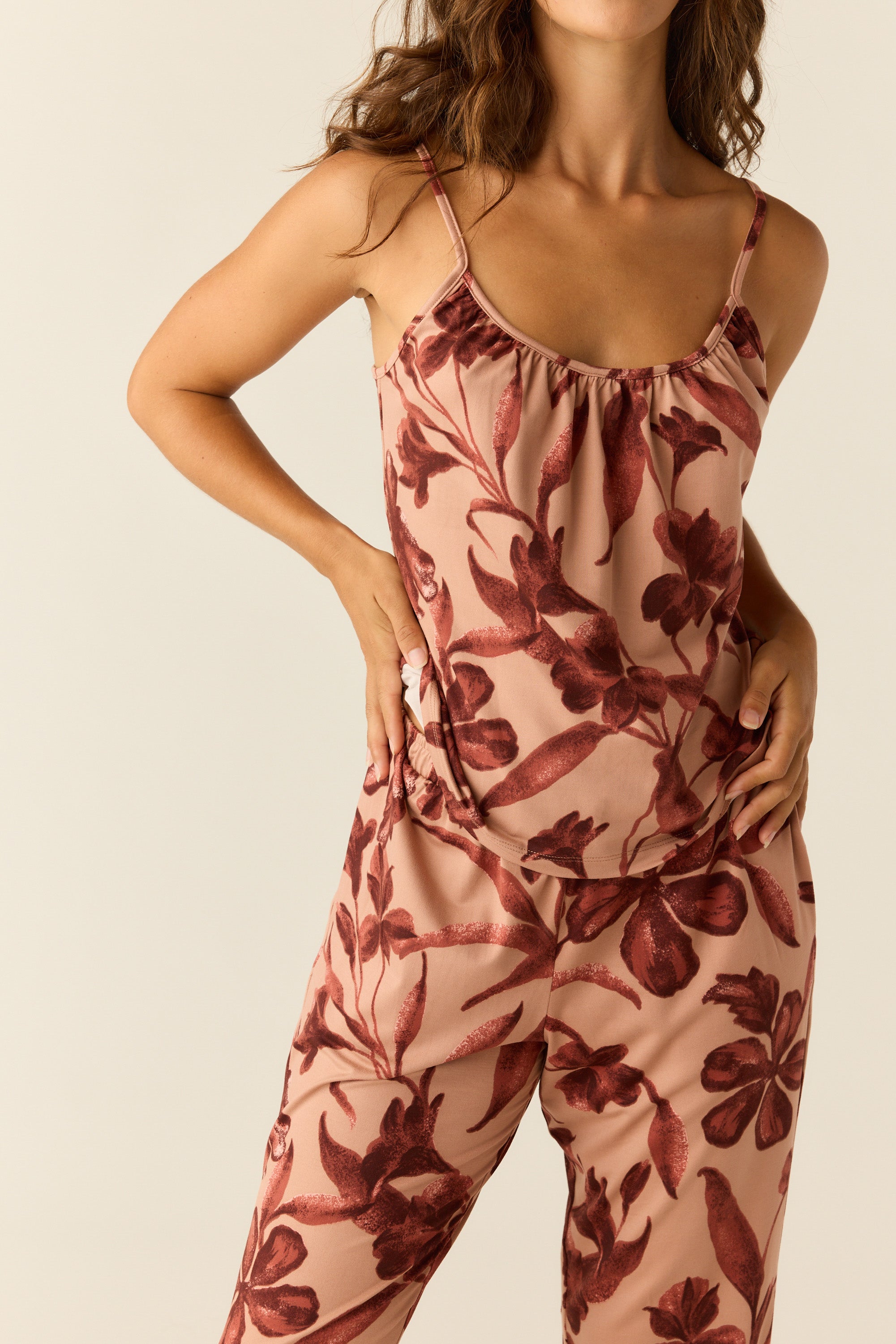 Feminine and airy, the Bella offers simplicity without compromising style. It features a ruched scoop neck cami with a wide leg pant.