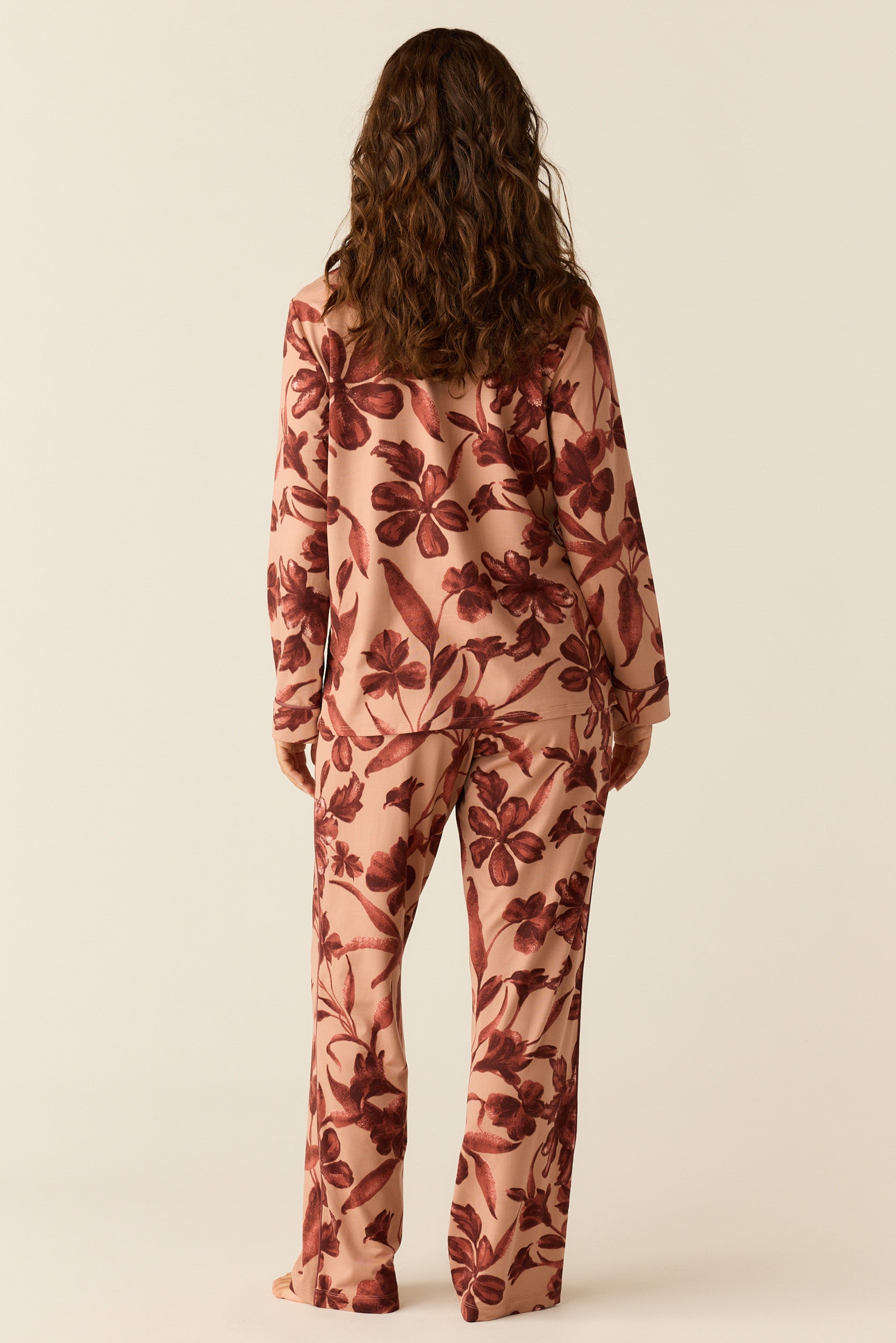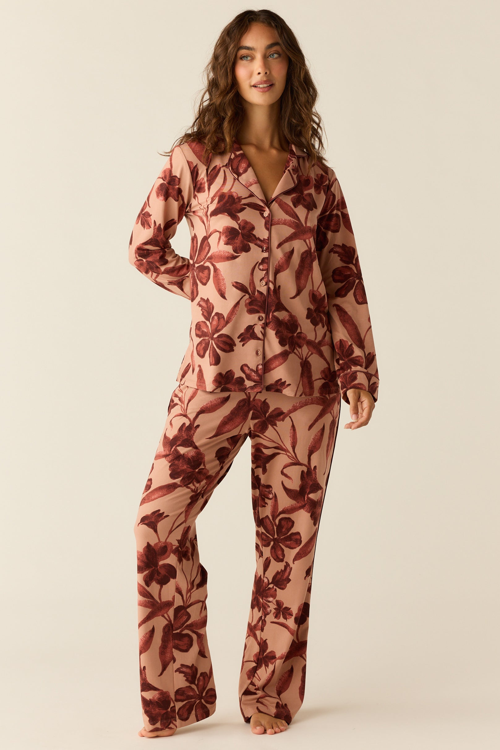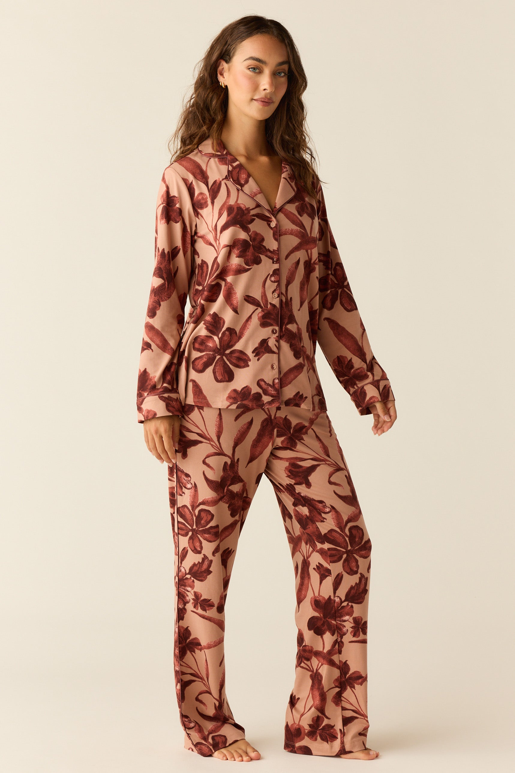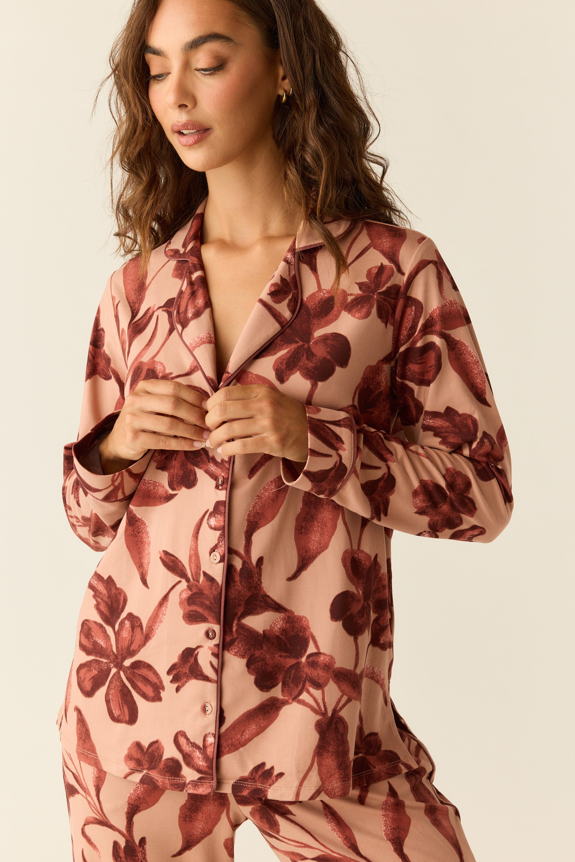 With a top that hits right below the hip and a flattering straight leg pant with pockets, it's our most sophisticated pajama yet. We've added covered buttons and contrast piping for that extra special touch.