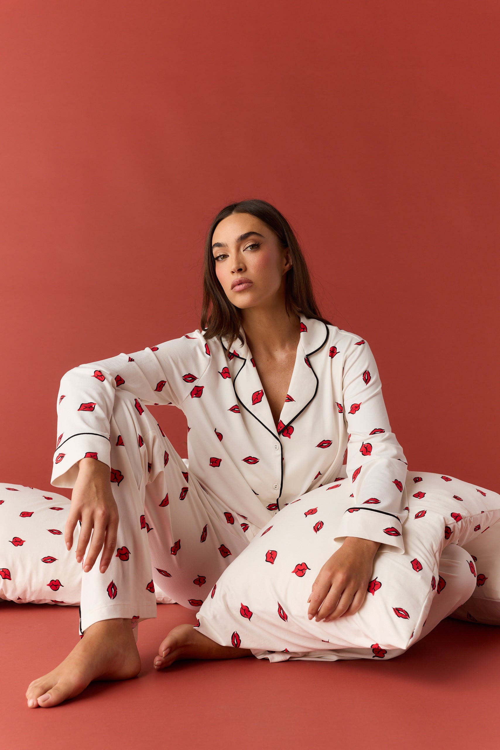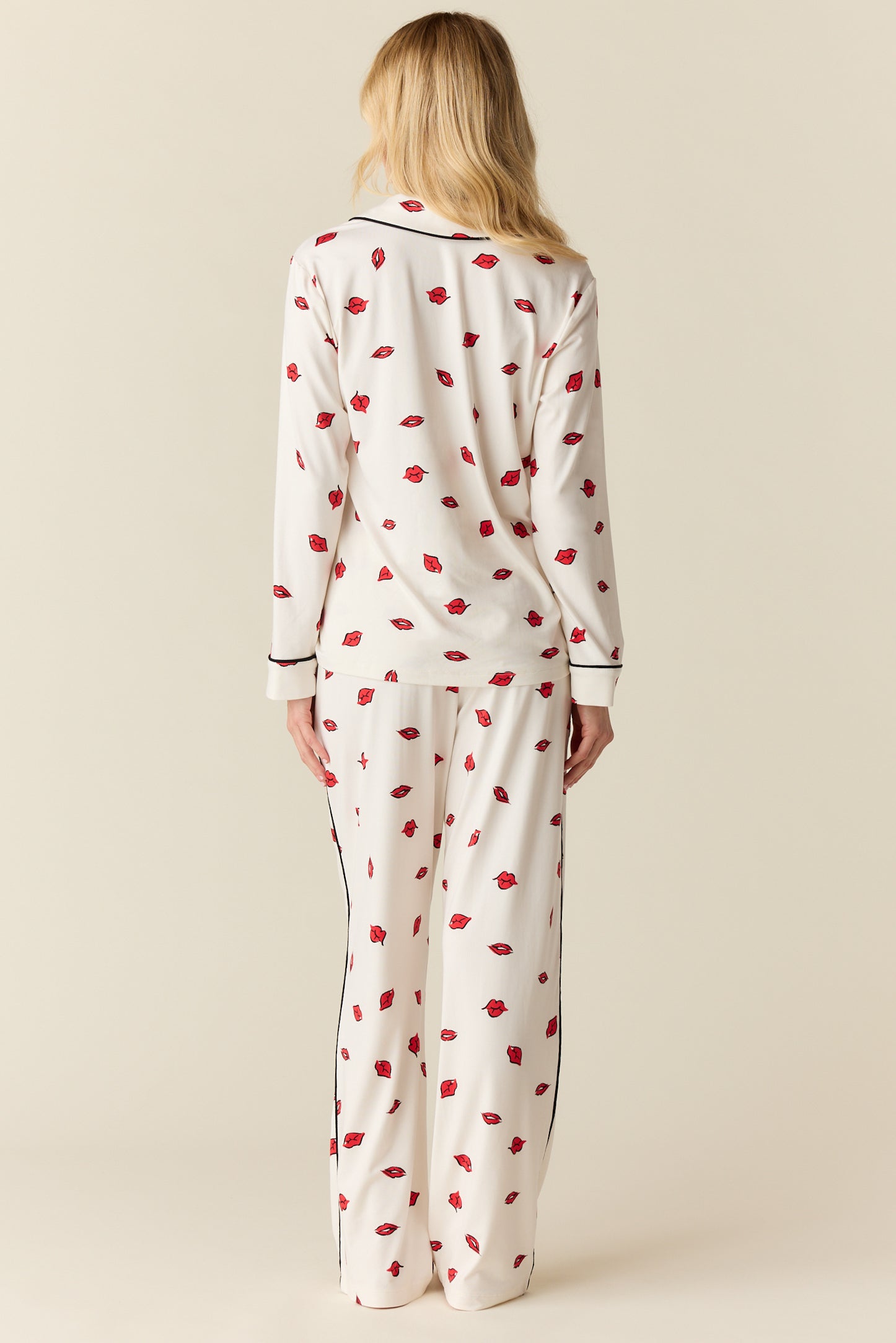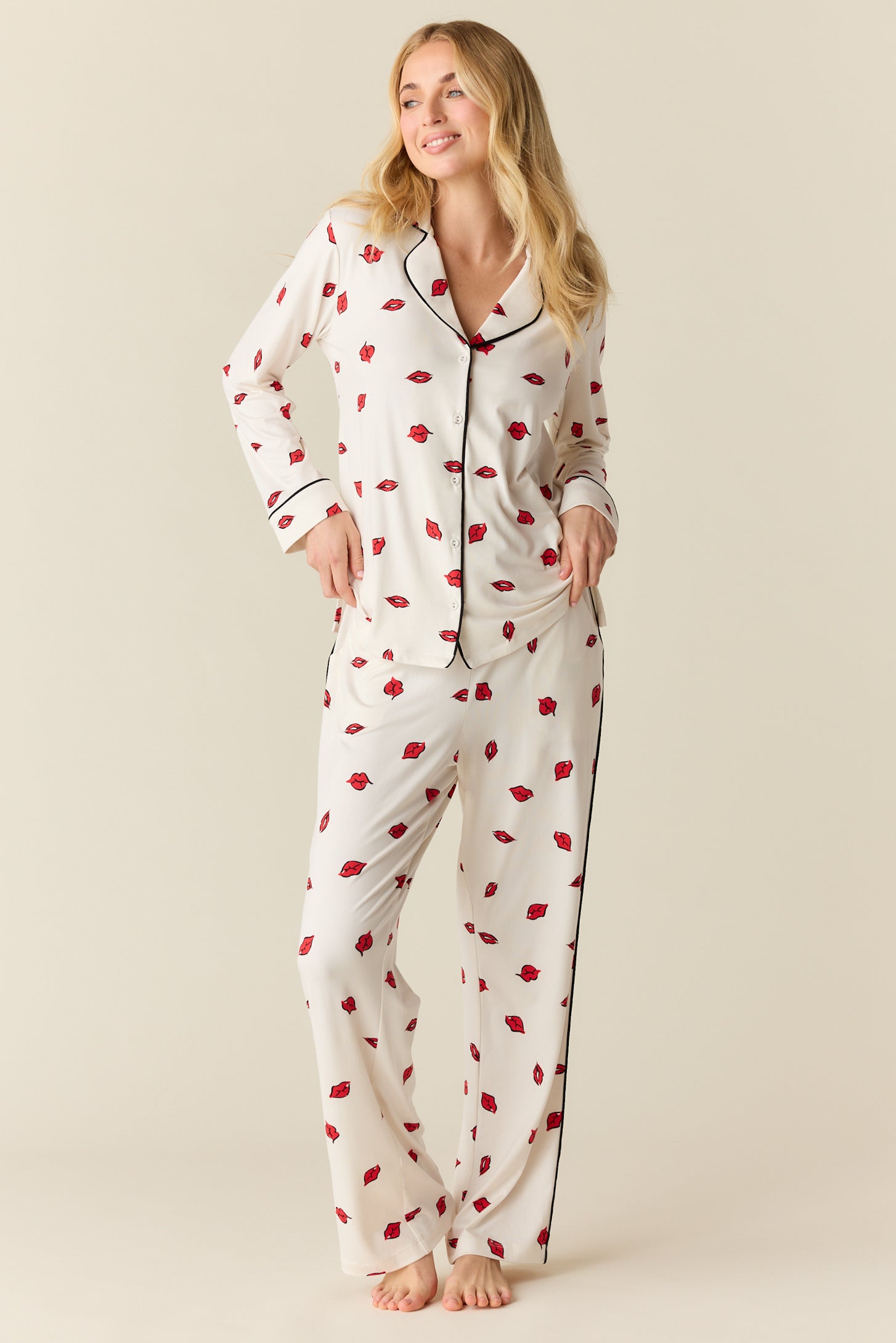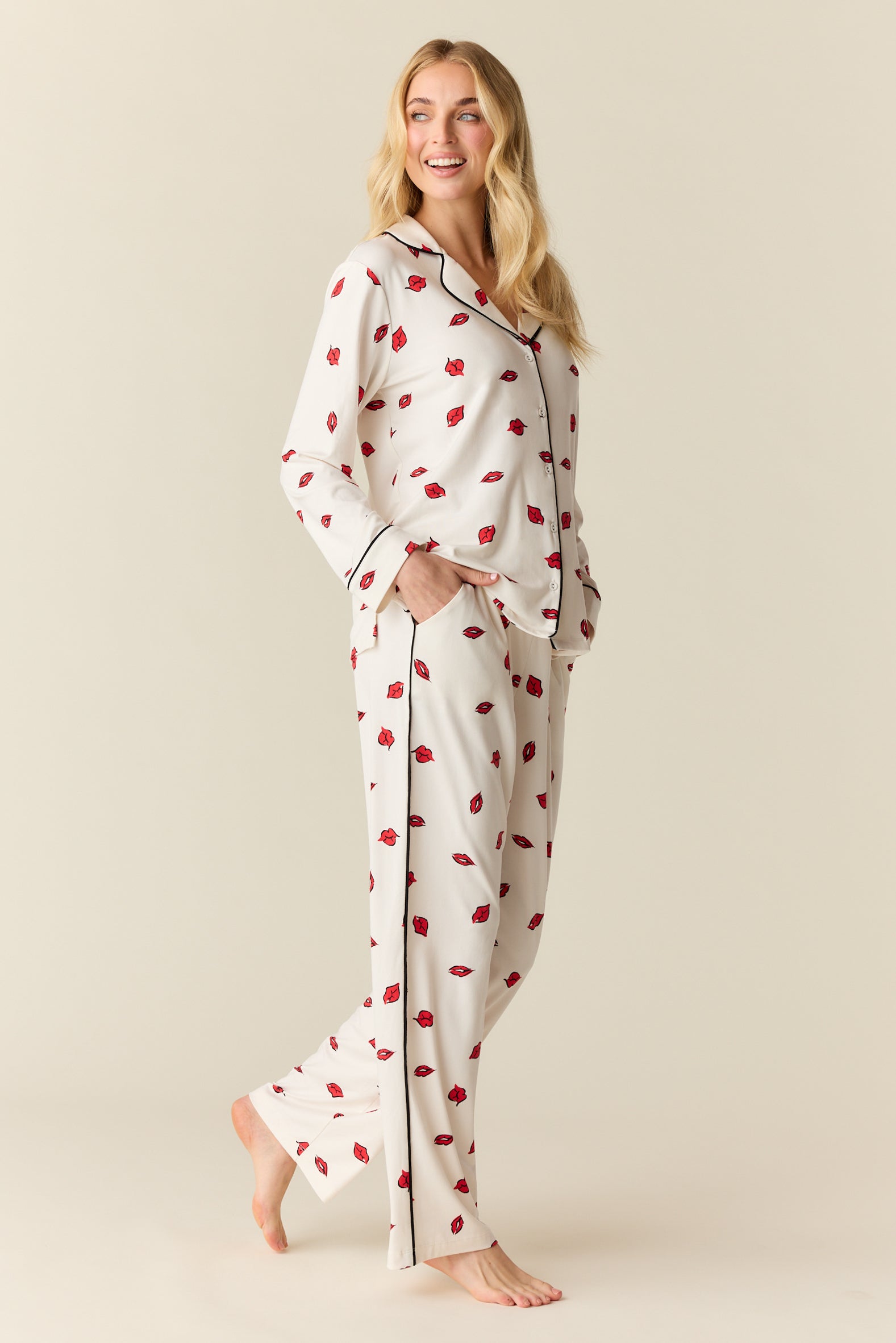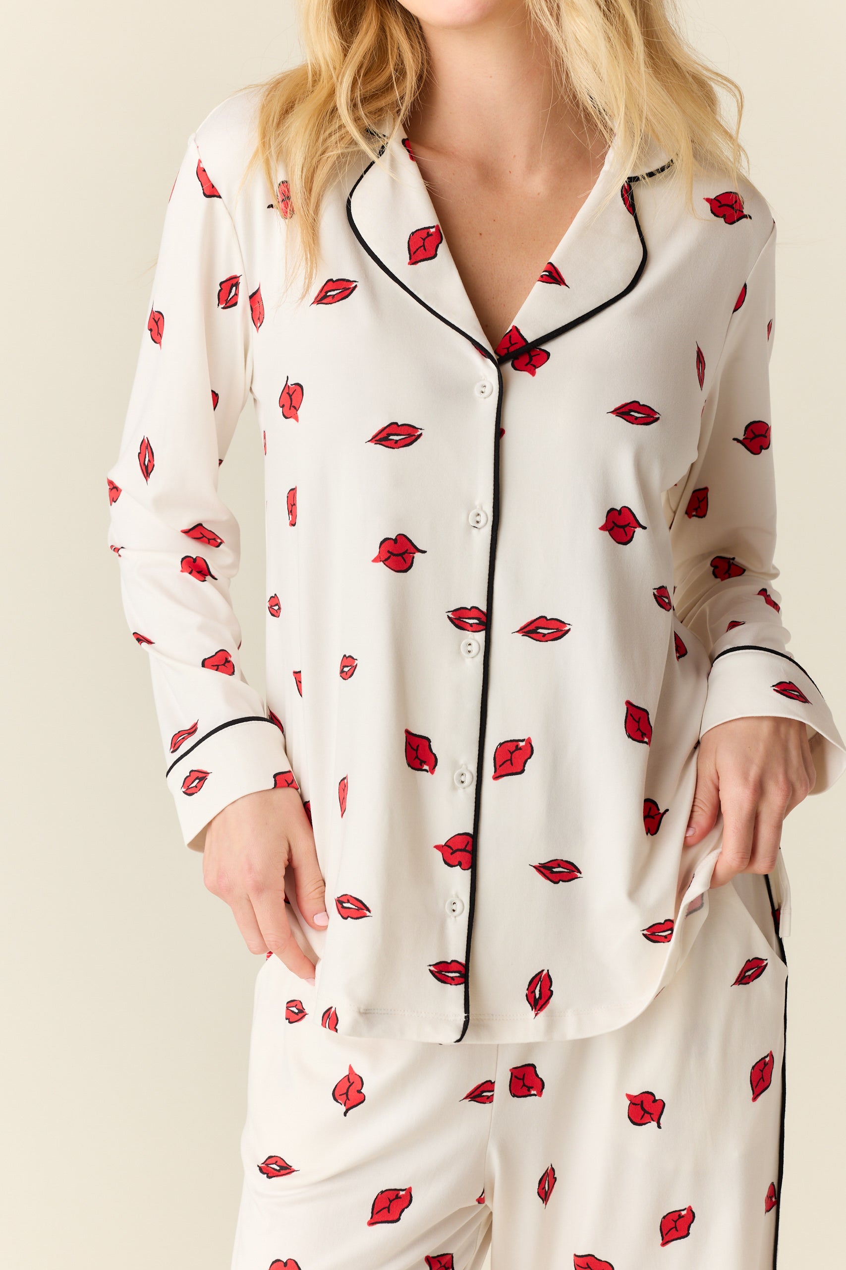 With a top that hits right below the hip and a flattering straight leg pant with pockets, it's our most sophisticated pajama yet. We've added covered buttons and contrast piping for that extra special touch.