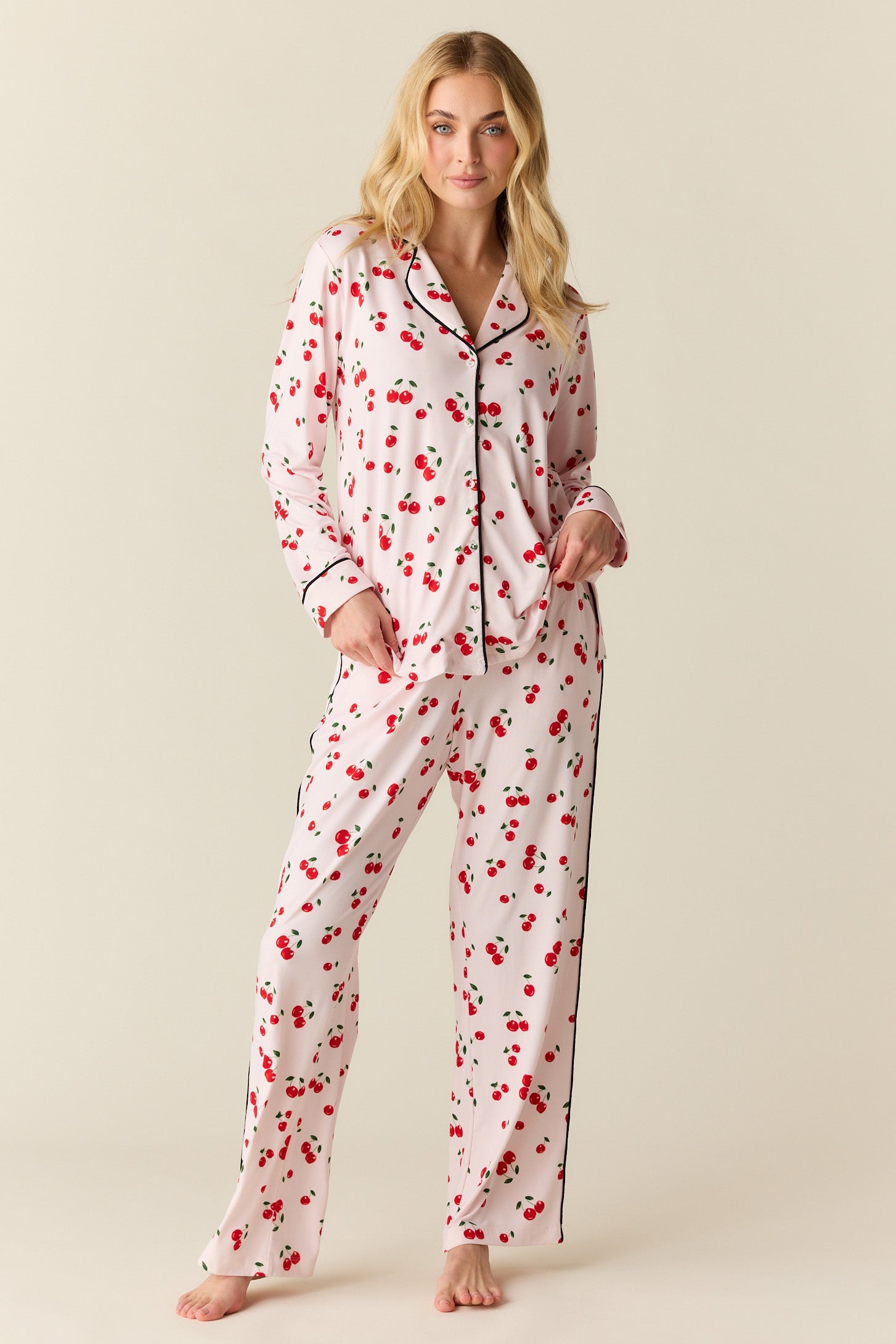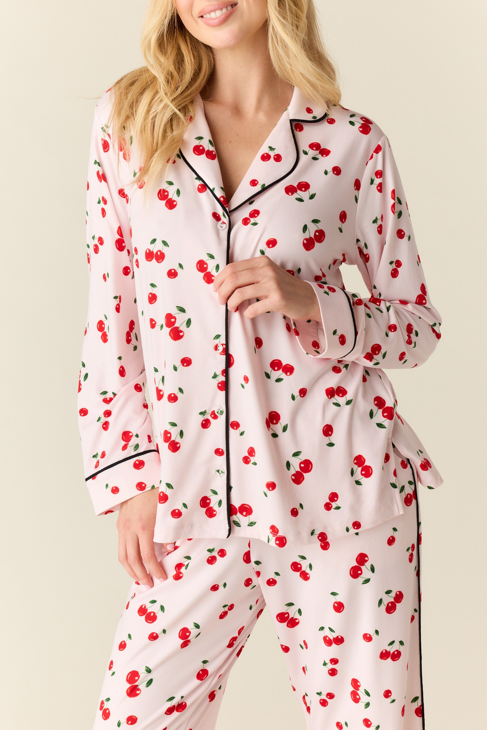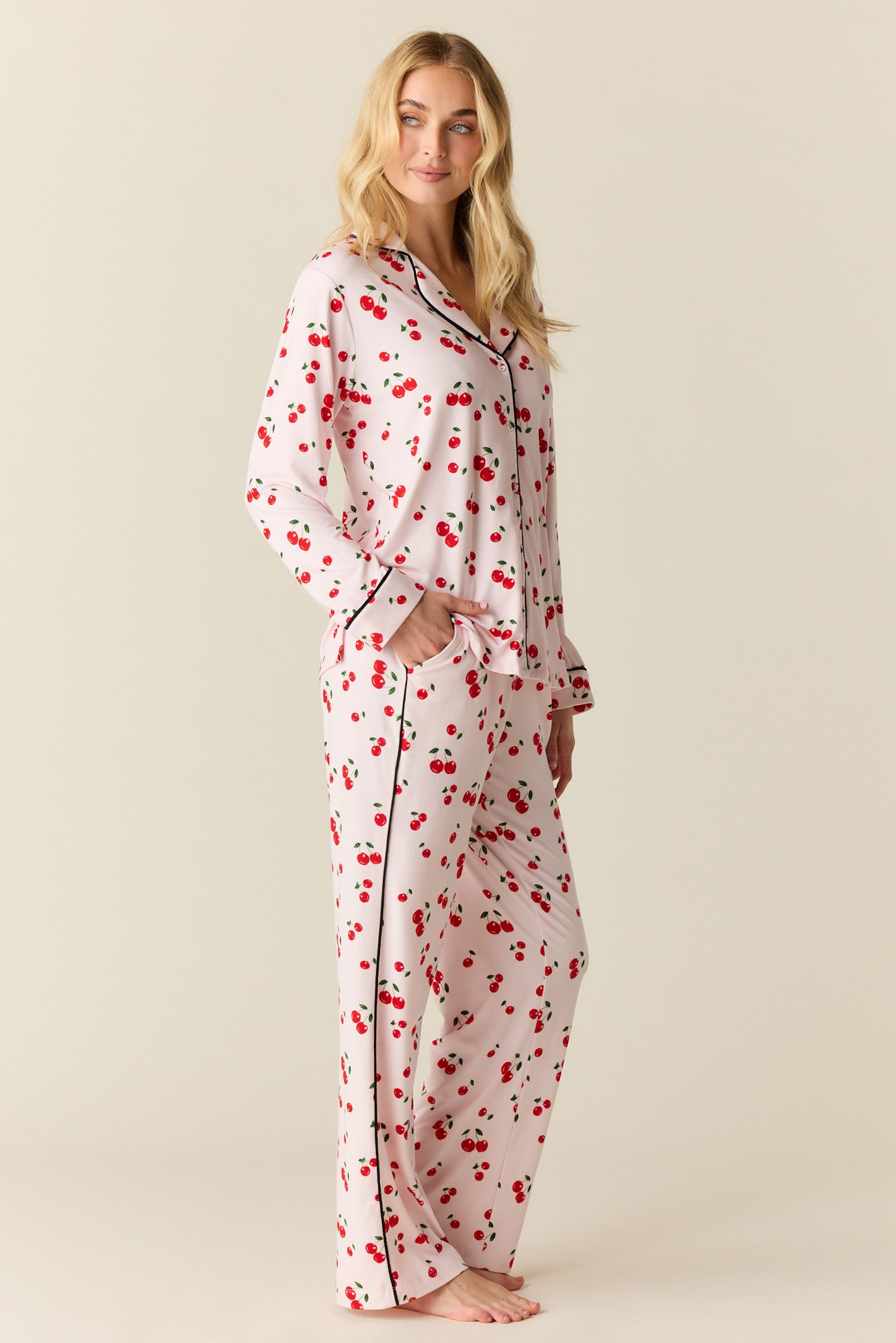 With a top that hits right below the hip and a flattering straight leg pant with pockets, it's our most sophisticated pajama yet. We've added covered buttons and contrast piping for that extra special touch.