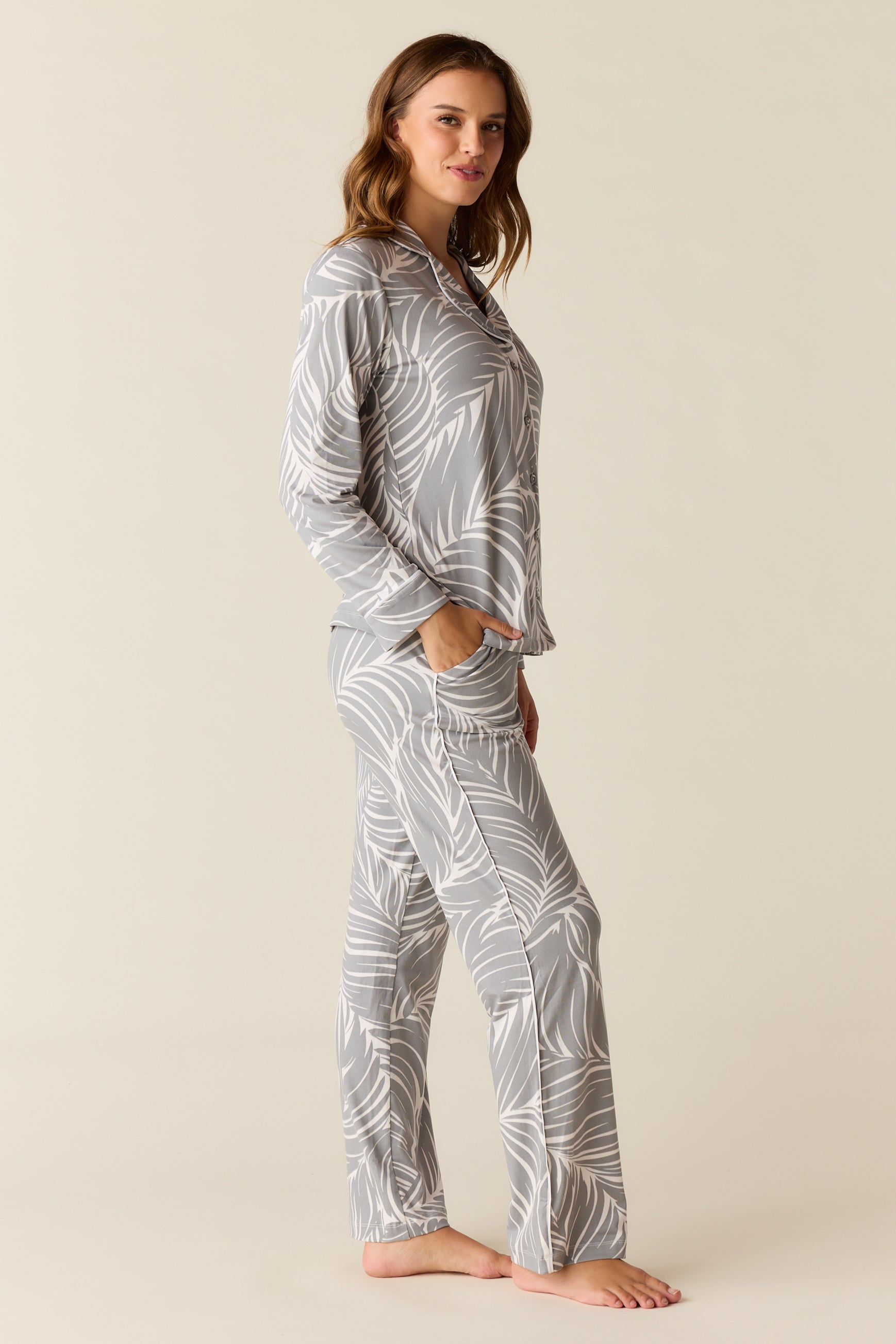 With a top that hits right below the hip and a flattering straight leg pant with pockets, it's our most sophisticated pajama yet. We've added covered buttons and contrast piping for that extra special touch.